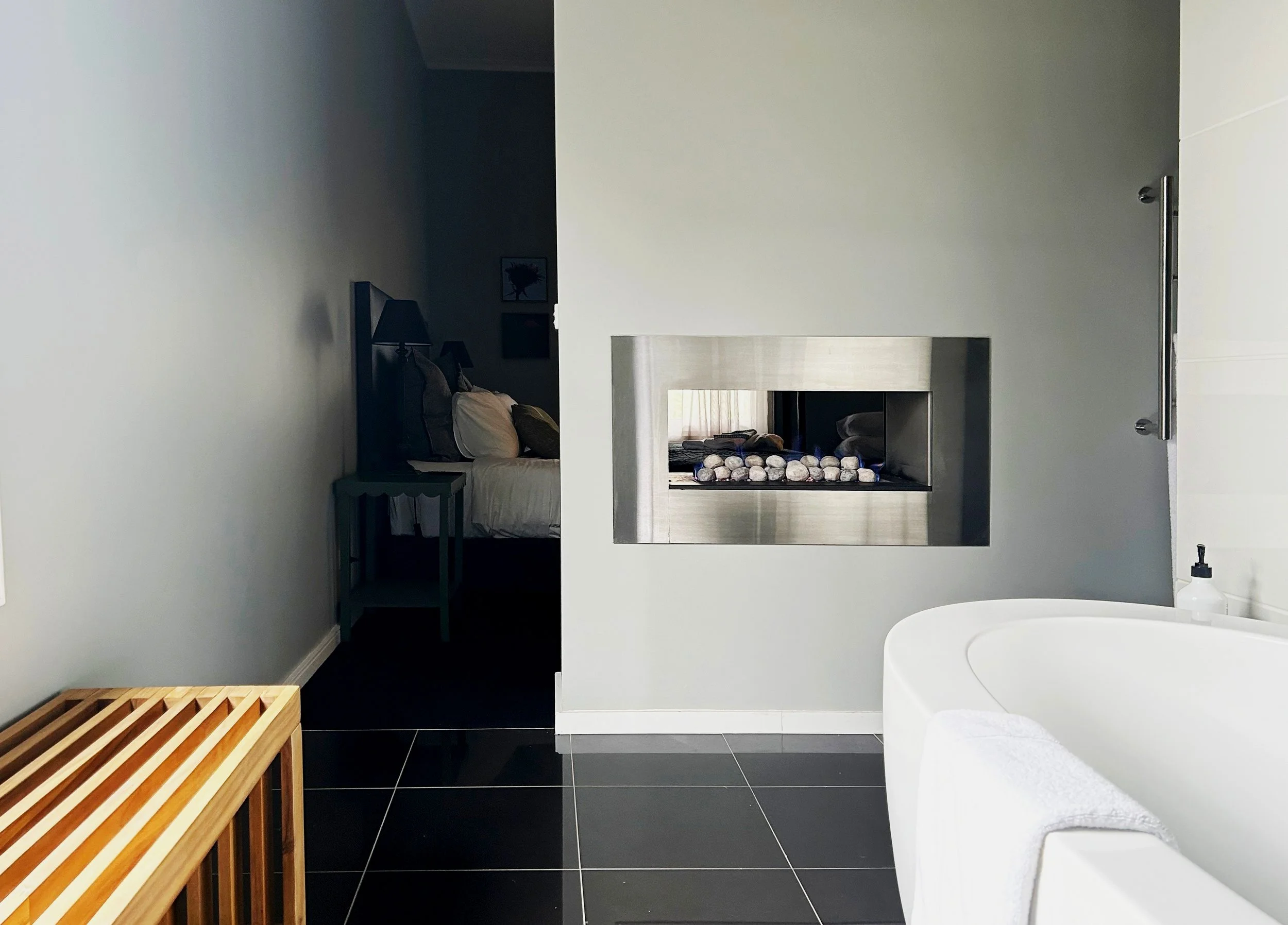 Soak in the freestanding bath as you unwind by the warmth of the double-sided fireplace.